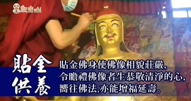 貼金是佛教的傳統,也是佛弟子的重要修行。對佛像貼金,代表對佛最高的崇敬。「金」乃是佛教七寶之首,亦是高貴的象徵…