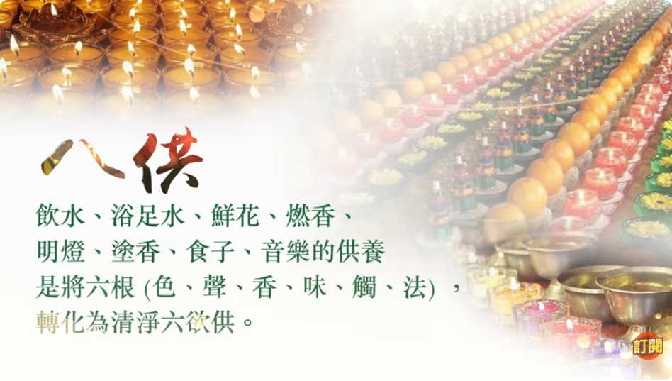 八供(飲水、浴足水、鮮花、燃香、明燈、塗香、食子、音樂)的供養是將六根(色、聲、香、味、觸、法)轉化為清淨六欲供。行者應有正確的發心與清淨的供養心,才是真正積聚福慧資糧的關鍵所在。