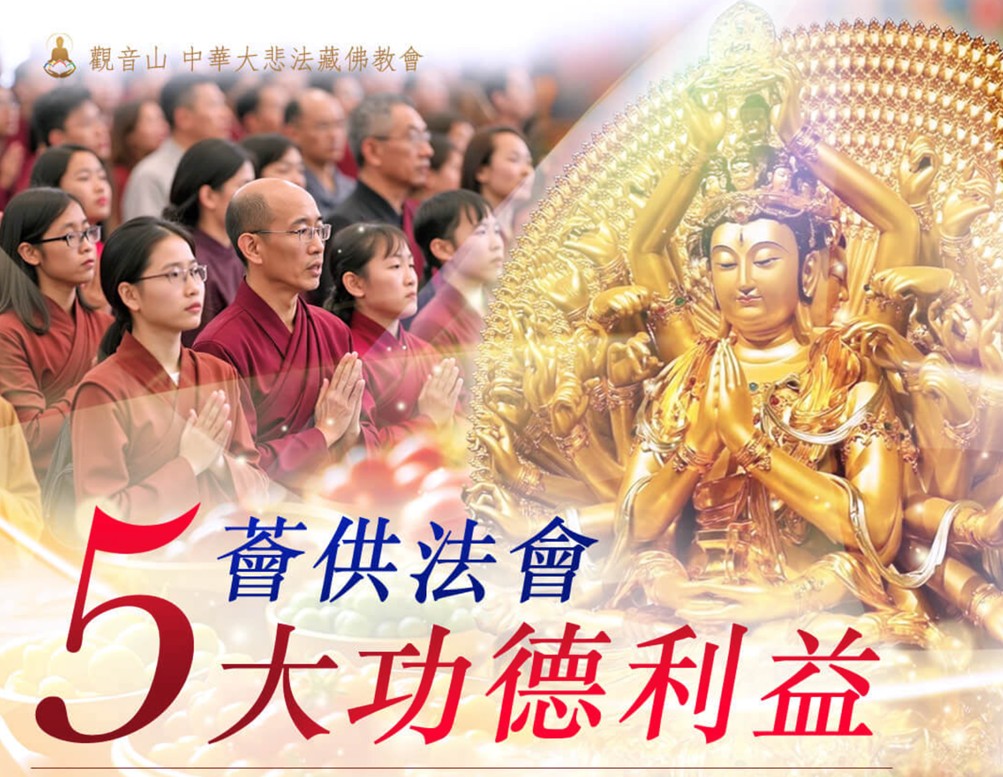 佛誕浴佛慶讚法會,觀音山將備辦豐盛的薈供品上供本師 釋迦牟尼佛,且在法會圓滿後,將薈供品捐贈至觀音山蔬食館、需要物資之單位團體,與十方大眾廣結善緣。以此上供下施之廣大功德力,可消除參與者外、內、密障礙,具足世間與出世間的福德。觀音山法藏YouTube與官方Facebook同步全球直播,令海內外眾弟子善信共襄盛舉,歡慶佛誕。